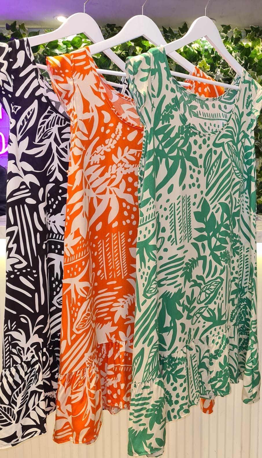 Vestido Corto de Fibrana Estampada. Medidas Aproximadas: Sisa 40 cm Largo 98 cm.